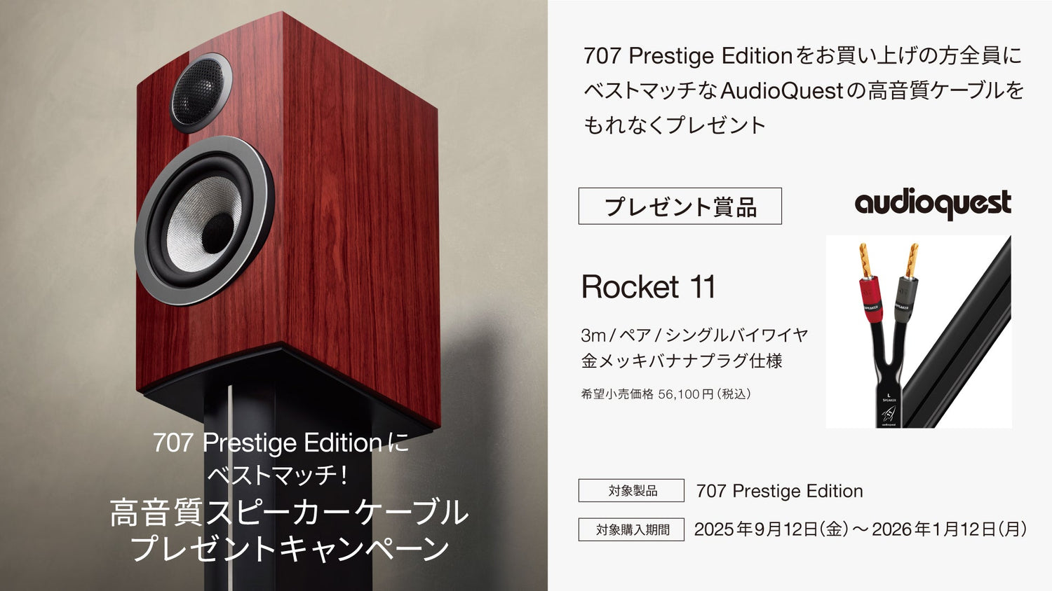 Bowers & Wilkinsは、2025年10月17日(金)より「707 Prestige Editionにベストマッチ!高音質スピーカーケーブルプレゼントキャンペーン」を実施いたします。 対象購入期間中に日本国内1,000組限定の特別なブックシェルフスピーカー「707 Prestige Edition」をご購入の上、ご応募いただいた方全員に、ベストマッチなAudioQuestの高音質スピーカーケーブル「Rocketシリーズ」の「Rocket 11」(3m / ペア /...